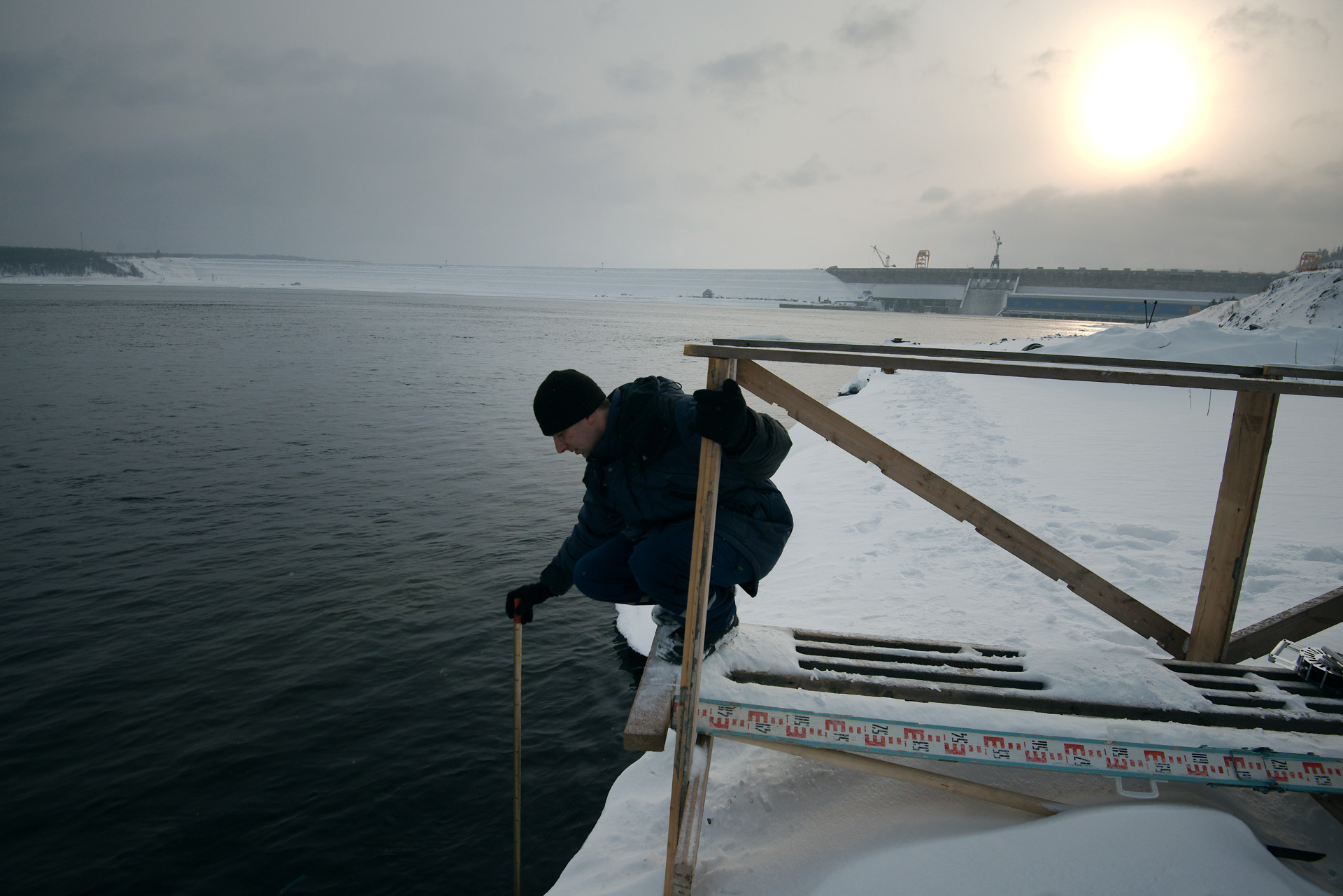 The hydrological service of the HPP conducts regular monitoring of the state of the reservoir. It is carried out by a group of hydrologists who travel daily in any weather conditions 2 times a day to measure the water level in the reservoir, carried out at reference points, ice thickness, and snow cover. Hydrologists also measure the temperature of water in thermal sections with hydroelectric thermometers. All data is processed automatically. After filling the reservoir, monitoring will also be carried out automatically.